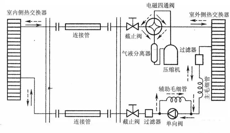 3、 熱泵系統(tǒng) 。與單冷系統(tǒng)情況相同,熱泵運行是否正常,主要檢查四通換向閥的工作情況。換向閥換向時,可聽到有比較響的氣體流動聲以及電磁閥頂針的撞擊聲(電磁場吸動閥心),當(dāng)電磁閥在換向過程中聽不到上述兩種聲音,那電磁閥可能出故障。
