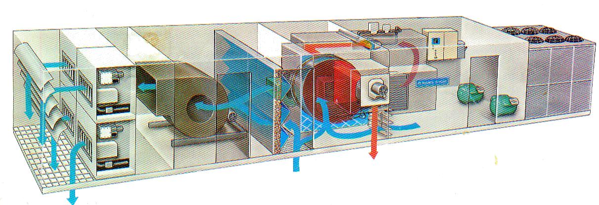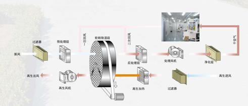 轉(zhuǎn)輪除濕機(jī)的工作流程可分幾個(gè)部分完成:預(yù)冷 / 預(yù)熱( 供選件 ) — 轉(zhuǎn)輪除濕 —后冷 / 后熱( 供選件 )