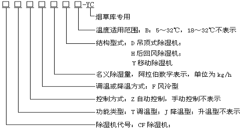 型號(hào)示例: CFZF20-YC 表示名義除濕量為20kg/h,進(jìn)風(fēng)溫度1832℃,固定式自動(dòng)調(diào)溫型煙草庫(kù)專用除濕機(jī)組。
