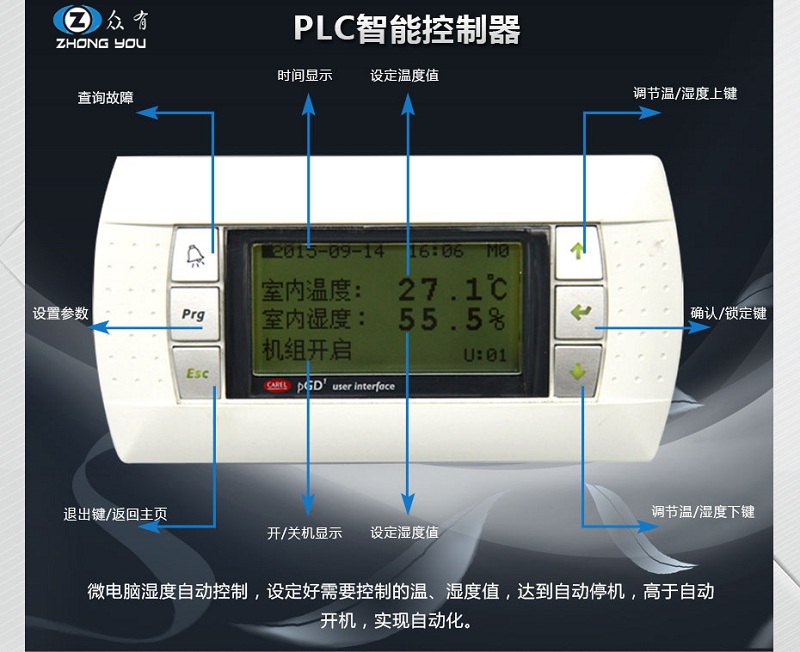 1. 采用國際品牌可編程PLC控制器,獨有的微電腦智能全自動控制系統,用戶只要設定好所需的溫濕度控制范圍,機組即自動判斷運行負荷進行能量調節,按最經濟的運行模式自動運行,節約了運行費用;控制器預留遠程控制接口,可方便用戶遠程集中控制,節省管理。