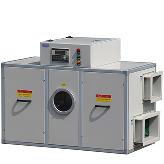 同時,在再生區域,另一路空氣先經過再生加熱器后,變成高溫空氣(一般為100~140度)并穿過吸濕后的轉輪,使轉輪中已吸附的水份蒸發,從而再生空氣因水份的蒸發而變成濕空氣,同時溫度下降;之后,再通過再生風機將濕空氣排除到室外。