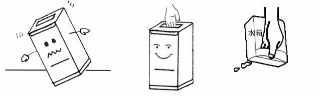 在搬動或收藏時請勿將除濕機側(cè)放或倒置。移動時直接由把手提起或用萬向輪移動除濕機。移動或搬用前,請先倒出水箱內(nèi)積水。